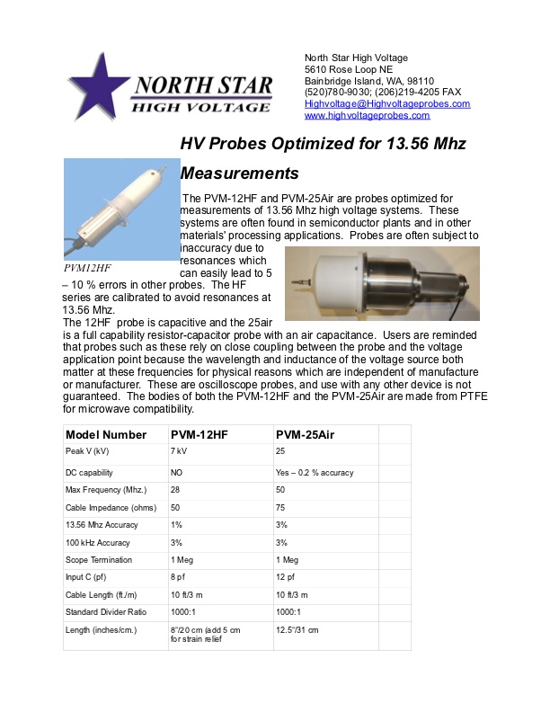 “RF from 13.56 Mhz sources is applied in a wide variety of industrial situations. We have developed a probe which measures this important voltage source at up to 10 kV. This overcomes the RMS power limitations of standard probes. This probe measures from 100 kHz – 50 Mhz for use with either scopes or meters”
